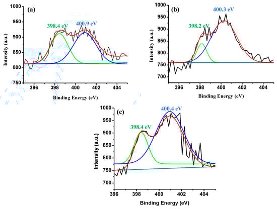 XPS high-resolution N 1s spectra of (a) N-rGO-1N-600 °C, (b) N-rGO-2N-600 °C and (c) N-rGO-3N-600 °C.