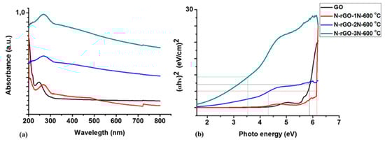 (a) UV-Vis absorption spectra and (b) Tauc plots for GO, N-rGO-1N-600 °C, N-rGO-2N-600 °C and N-rGO-3N-600 °C.