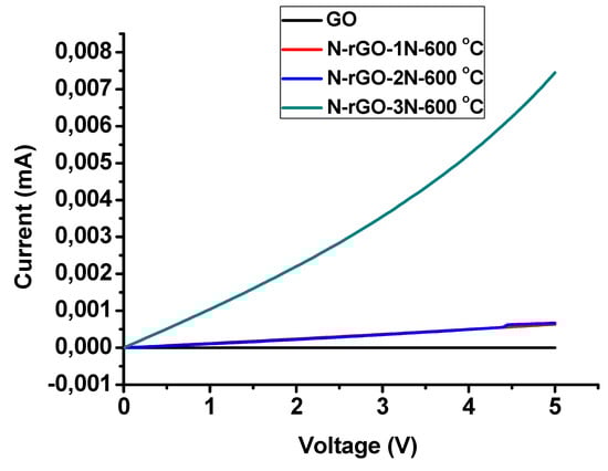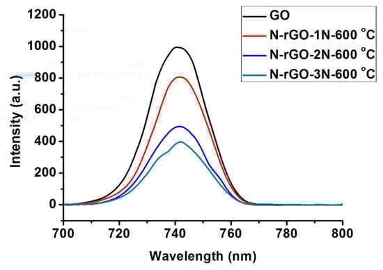 The intra-band-gap, which is associated with local defect functions as a trap for free carriers, affects the recombination and electron transport [84]. All N-rGO from different nitrogen precursors luminescence at e-/h+ recombination rate of 745 nm as shown in Figure 10. However, their photoluminescence peak intensities are different. The variation of nitrogen precursor showed the enhancement of photoluminescence peak intensity. Van Khai et al. [85] reported that the doping temperatures tend to cause a shift in wavelength, which is due to the presence of quaternary-N, whereas the presence of pyrrolic-N and pyridinic-N was closely related with enhancement of photoluminescence peak intensity. Therefore, the enhanced photoluminescence intensity in N-rGO corresponds to the decrease density of pyrrolic-N. However, the increased density of pyridinic-N may be correlated with the decrease of non-radiative recombination. N-rGO-1N-600 °C with a lower nitrogen content had a higher photoluminescence peak intensity while N-rGO-3N-600 °C with a higher nitrogen content was of lower intensity This further suggests that N-rGO-3N-600 °C has a lower rate of a e-/h+ recombination.