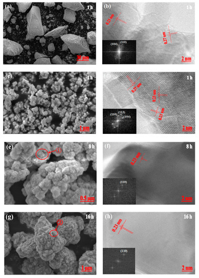 Figure 6e presents the small sheet morphology of the primary particles and the non-compact sphere morphology of the secondary agglomerate particles. The corresponding HR-TEM image (Figure 6f) presents the (110) facet with a d-spacing of 0.23 nm. However, the (104) and (113) facets disappeared after being exposed at a nucleation time of 2 h, which signified that the primary particles were arranged in a relatively regular manner and the growth speed of the particles had a high preference for the normal direction of the (110) facet orientation. The particles kept agglomerating during the crystallization from 8 h to 16 h. The red circle marked in the SEM image shows that the primary particle seems to have increased (Figure 6g). The HR-TEM image, presented in Figure 6h, also shows only the (110) facet orientation. After crystallization for 32 h, the secondary particles agglomerated into compact sphere shapes and the exposed primary particles had a similar particle size compared to those at 16 h, which was consistent with the conclusion drawn from Figure 5b. Moreover, the HR-TEM image only presents the (110) facet, indicating that the (110) facet had an absolute growth advantage and this advantage could inhibit the growth of the other facets after 8 h. It appears that the grain size of the primary sheet-shaped particle gradually increased. It is worth being mentioning that the FFT of these particles strongly supports the d-spacing results from the HR-TEM images.