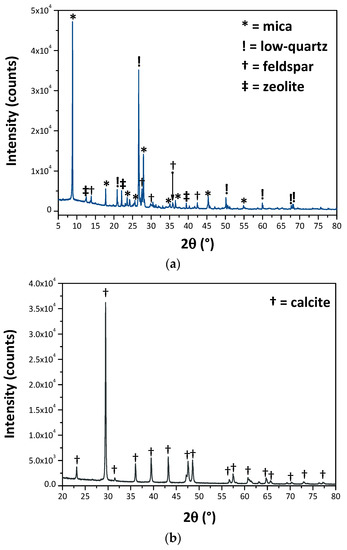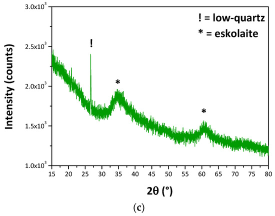 The mineralogical composition of the wastes has been revealed by XRD, Figure 1a–c. GS (Figure 1a) is mainly (qualitatively) composed of low-quartz, a mica group mineral, a feldspar, and a zeolite group mineral as well—this latter likely coming from atmospheric weathering of the granite. As suggested before, MS is composed by calcium carbonate, as all of the reflections are assignable to CaCO3 (Figure 1b), whilst GS showed itself to have a very low crystalline nature, the only crystalline phases detected being low-quartz, and eskolaite (Cr2O3), as shown in Figure 1c [7].