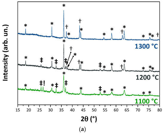 The temperatures at which the prepared mixtures were fired (1100, 1200 and 1300 °C) were selected considering results of previous works [7,12]. XRD patterns of the formulations 50GS:ES and 30GS:20MS:ES after thermal treatment at such temperatures are shown in Figure 2a,b. When GS and ES are mixed in equal wt.% amounts, and thermally treated at high temperatures, both the color and the mineralogy changes, Figure 2a. At 1100 °C, the main crystalline phases detected are: (i) a mineral of the spinel group; (ii) nickel oxide (bunsenite); (iii) a mineral of the olivine group (tentatively: Ni2SiO4); (iv), and low-quartz. Increasing the thermal treatment temperature to 1200 °C, the residual low-quartz disappeared, probably enriching the glassy phase. At this isotherm, the mineralogical phases are: (i) the spinel; (ii) the mineral of the olivine group; and (iii) NiO. At the highest temperature, 1300 °C, spinel (68.7 wt.%) and NiO (31.3 wt.%) are the only two crystalline phases, as listed in Table 3.