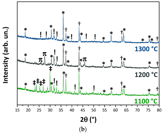XRD patterns of 50GS:ES (a) and 30MS:20GS:ES (b) after the thermal treatment at 1100 °C, 1200 °C and 1300 °C. Symbols in (a) * = spinel; † = NiO; ‡ = Ni2SiO4; ! = low-quartz. Symbols, in (b) * = spinel; † = NiO; ‡ = wollastonite; π = pseudowollastonite; ! = alite.