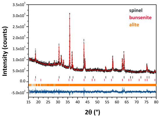 Graphic output of the Rietveld refinement of specimen 30MS:20GS:ES_1300. The red continuous line represents the calculated pattern, the black open circles represent the observed pattern, and the difference curve between observed and calculated profiles is plotted below. The position of reflections is indicated by the small vertical bars (black: spinel; red: bunsenite; orange: alite).