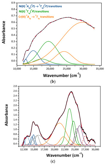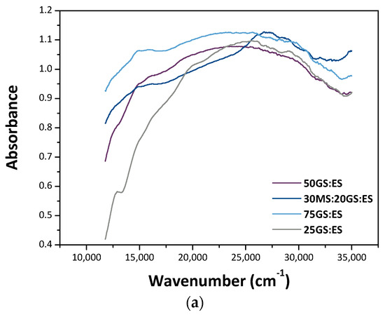 Optical spectra of all the specimens fired at 1300 °C are depicted in Figure 4a. They all show similar optical characteristics, with the exception of specimen 30MS:20GS:ES_1300, in which a drop-in absorption in the 25,000–15,000 cm−1 region, due to the non-negligible presence of Ca3SiO5, is detectable, cf. Table 3. In this work, we will describe in detail only the optical spectrum of 25GS:ES_1300, Figure 4b. The UV-vis spectrum of this specimen is dominated by Cr3+ and Ni2+ optical signatures. The bands at low energy, in blue in Figure 4b, can be tentatively assigned to Ni(II) 3A2g(3F)→3T1g(3F) transitions [18]. In addition, the weak bands at ~17,500–20,000 cm−1 (bands in green in Figure 4a) belong to Ni(II) 3T1g(3P) transitions [18]. The bands at higher energy (those in orange in Figure 4b) are tentatively assigned to Cr(III) 4A2g→4T1g electronic transitions [19]. The signal at high energy (~35,000 cm−1) is due to charge transfers between metals and the oxygen ions [20]. The UV-vis spectrum of specimen ES fired at 1200 °C is also reported for comparison (Figure 4c). In it, the bands in light blue were tentatively assigned to Ni(II) 3T1g(3F) transitions; those in dark blue to 3A2g(F)→3T1g(F) transitions of Ni(II); those in orange to Ni(II) 3T1g(3P) transitions, and those in violet to Ni(II) 1T2g transitions [7]. Absorbance bands in light grey and green are tentatively assigned to Cr(III) transitions: 4A2g→4T2g and 4A2g→4T1g(4F), respectively [7].