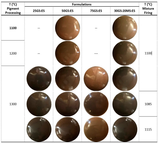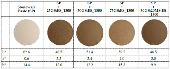 The addition of the developed pigments to the stoneware paste did not induce the appearance of defects neither change of the material’s technical properties allowing to obtain nice colored stoneware bodies. The pigments made from GS- and ES-originated colors from dark beige (camel) to light brown, tendentiously darker with increasing amounts of ES. The 30GS:20MS:ES_1300 pigment also originates light brown hues (Figure 7), but darker than those obtained with the binary mixtures. This behavior is opposite to that observed on glazes (TB and OM). Finally, we should mention that the addition of the actual pigments did not induce the appearance of defects neither changes on the technical properties allowing to obtain nice colored stoneware bodies.