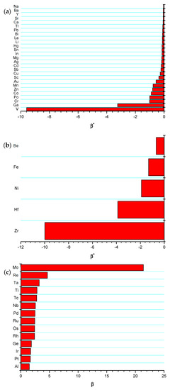 A general overview of Figure 3a shows that the critical coefficients are all negative, with no exceptions. The same finding can be observed in Figure 3b, thus indicating that the effect of in these alloys is dictated by the sign of . The intermetallic formation certainly affects the magnitude of , but not its sign. Vice versa, a positive and greater that one value of (again with no exceptions) is revealed for all systems belonging to group III (see Figure 3c). It can easily demonstrated (see Equation (27)) that the two stability criteria ( for groups I and II, and for group III), along the results that are reported in Figure 2 can also be translated into where can be regarded as a critical value for thermodynamic stability occurrence. The latter parameter should satisfy the following conditions: and . It is important to highlight that both conditions do not depend on the sign of and that they should be simultaneously fulfilled.