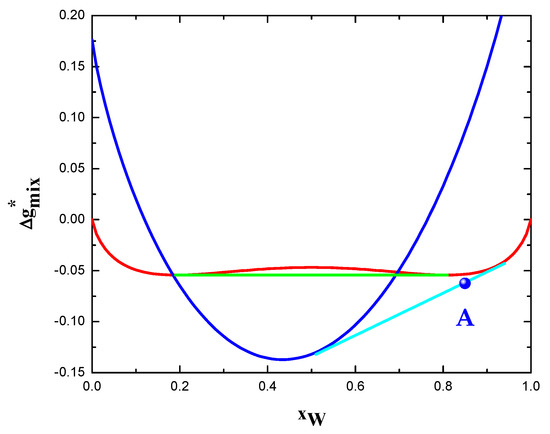 A parallel investigation can be performed for those systems showing negative interaction energy in the bulk, i.e., . As an example of these alloys, Figure 2c illustrates the thermodynamic phase equilibria taking place in the W-Nb system. A critical value of the coefficient can also be identified for this category of alloys. However, in this case, ascertains the condition for at least one composition of this alloy. It can also be observed that the polycrystalline structure is thermodynamically stable when the criteria ( are fulfilled. The compositional range of these stable alloys is given in Figure 2c by the common tangent (cyan line), which represents the coexistence of the grain boundary phase (blue curve) and the grained solid solution (red curve).
