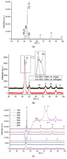XRD patterns of the powder after different time of MA in nitrogen is presented in Figure 2c. At 10 h of milling the main peaks of ferrite (α-Fe) was observed. The diffraction peaks of γ-Fe appeared after 20 h of MA. The α-Fe peaks intensity decreased gradually, while the γ-Fe peaks became stronger. Two-phase structure was observed (see enlarged XRD main peak after 40 h in Figure 2c) from 40 to 80 h of ball milling. However, after 90 h, the only peaks from austenite were detected. A similar trend was reported by Cisneros et al., where after 80 and 96 h of MA fully austenitic structure was confirmed by XRD analysis [37].