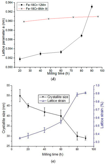 Figure 2d displays an expansion of a lattice parameter of the powder MA in nitrogen as a function of milling time. The lattice parameter constantly increases with increased milling time, contrary to the data reported by Salahinejad et al. [38], in which this parameter is almost unchanged. An increase in a lattice parameter is usually caused by the solubility of substitutional and interstitial alloying atoms [38]. These dissimilarities in the lattice parameter may be due to differences in chemical composition, parameters of MA process and initial powders used. Note that an abrupt increase in this parameter is observed between 60 to 90 h of MA that can be related to alteration of the manganese nitride powder solubility in the steel matrix (Figure 2d).