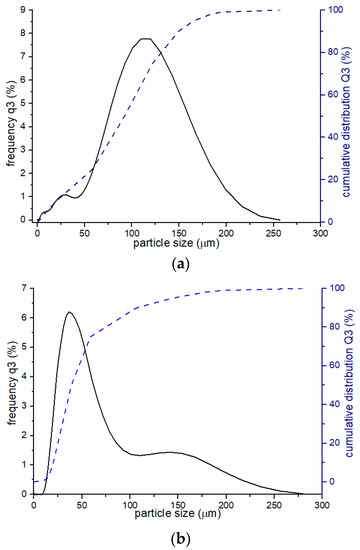 Granulometric analysis of the powders after (a) 1 h and (b) 90 h of MA.