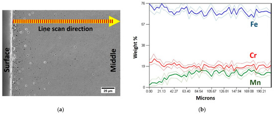 Note that in the HIP+HT–FC material the Mn content fluctuates with the distance from the surface of the sample to the core (see Figure 7). An ~3.5% lower manganese content on the surface of the tested material after furnace cooling is related to a vapor pressure of this element during prolonged HT process. Salak reported [42] that Mn has significantly higher vapor pressure at 1200 °C (~94.69 Pa) than such alloying elements as Fe and Cr, 8.40 × 10−3 and 3.13 × 10−2 Pa, respectively. Therefore, a vacuum sintering atmosphere can simultaneously reduce oxygen and carbon content, but also contribute to an evaporation of manganese from a surface of samples. This explains the Mn loss and porosity observed near the surface.