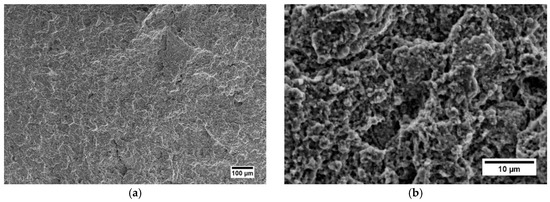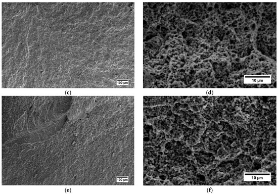 Mechanical properties of the steel after tensile testing are summarized in Table 6. An average tensile strength was obtained for both the as-HIPped and HIP+HT–FC samples, 934 ± 11 and 938 ± 8 MPa, respectively. The HIP+HT–WC sample has about 5% higher ultimate tensile strength (975 ± 10 MPa). Higher microhardness values and very low ductility of both as-HIPped and HIP+HT–WC samples, supported by surface fracture observations (Figure 10a,b,e,f) proves that this material is brittle. The furnace cooling heat treatment does not affect the tensile strength, but the elongation (εt) increases up to 3.51% ± 0.13% (see Figure 11). The ductile fracture of the HIP+HT–FC sample is observed (Figure 10d). This material has ~30% higher an ultimate tensile strength (UTS) of 650 MPa in comparison to results presented in [40], where the HIPping process was also applied. The Young modulus of the tested steel is relatively lower, due to the porosity.