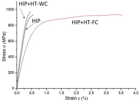 Tensile stress–strain curves for HIPped, HIP+HT–WC, and HIP+HT–FC samples.