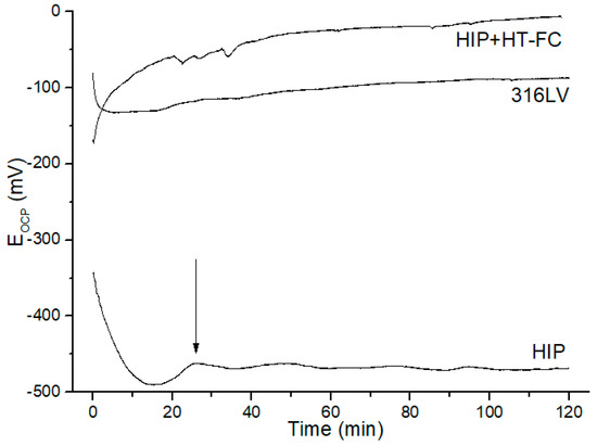 Corrosion resistance of the HIPped and heat treated with furnace cooling samples (HIP+HT–FC) and 316LV as a reference specimens was tested according ISO 10993–15 [34]. The PGP201 VoltaLab galvanostat/potentiostat (Radiometer Analytical, France) equipped with the VoltaMaster 4 software was used. As a corrosion medium, 70 mL of the Hank’s solution was used.