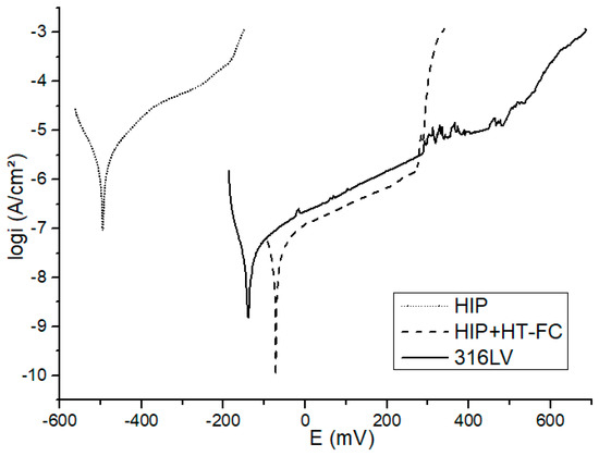 - The potentiodynamic curve of the heat treated and furnace cooled HIPped material was similar to 316LV, but the corrosion potential value was lower than 316LV. The corrosion current of the HIP+HT–FC and 316LV samples was similar. All of the above indicated that the HIPped and heat treated, furnace cooled material obtained in this work had similar corrosion properties to austenitic stainless steels (316LV) commonly used in medicine.