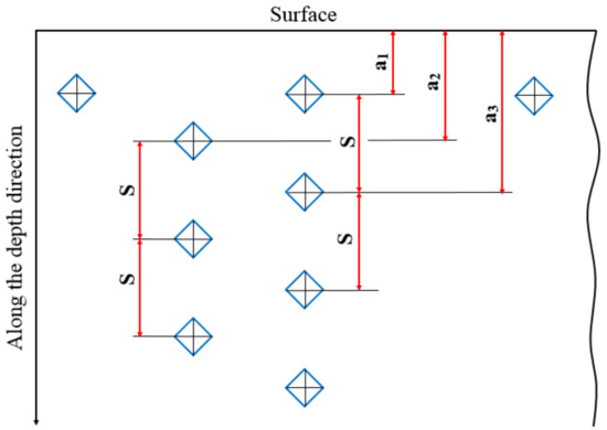 The phase composition was studied by XRD (D8 Advance, Bruker AXS, Karlsruhe, Germany, Cu Kα1 = 1.5406 Å) at 40 kV and 40 mA, with an incident angle of 0.5°, after ion implantation and vacuum carburizing. The scanning speed and angle range were 1°/min and 10°–90°, respectively. The penetration depths of X-ray was estimated to be 26 nm at incident angles of 0.5° [25]. Considering the maximum concentration distribution depth of the two implanted ions at 20–25 nm, 0.5° was chosen as the incident angle of the XRD test after carburization. The content of the retained austenite was determined with an X-350A X-ray stress analyzer (ST Stress Technology Co., Ltd., Handan, China). The surface morphology and phase structure of the samples were observed by Optical Microscope (OM) (Olympus, Tokyo, Japan) and a Nova NanoSEM50 environmental SEM (FEI, Hillsboro, OR, USA) equipped with EDS (OXFORD, Oxford, England) was also used. The corrosive fluid for OM comprised an alcohol solution containing 4% nitric acid (volume fraction). To obtain the effective case depth of the carburized layer, according to the GB/T 9450-2005 standard, Vickers hardness testing was used to determine the longitudinal section hardness of the samples under a 1 kgf (HV1) load, and each hardness value was the average of three measurements. In the Vickers hardness testing, the distance (S) between two adjacent indentation centers should not be less than 2.5 times of the indentation diagonal and the distance difference between successive adjacent indentation centers and part surfaces (a2–a1,) should not exceed 0.1 mm, as shown in Figure 1. The load time of the apparatus was 15 seconds. The Rockwell hardness of the surface and the core of the samples was measured by a Rockwell hardness tester (Shjingmi, Shanghai, China), and each hardness value was the average of five measurements. For the carburized surface, the depth of Rockwell indenter was about 0.08 mm; for the center, the depth of the Rockwell indenter was about 0.14 mm. The carbon element distribution on the surface of the carburized layer was determined by an electron probe microanalyzer (EPMA-1720, Shimadzu, kyoto, Japan). The test parameters were as follows—acceleration voltage, 10 kV; electron beam current, 200 nA; beam spot, 20 um; and test time, 20s.