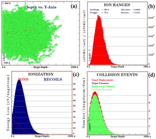 TRIM simulation of yttrium ion implantation for the (a) ion beam pattern, (b) ion ranges, (c) ionization distribution of ions, and (d) collision events.
