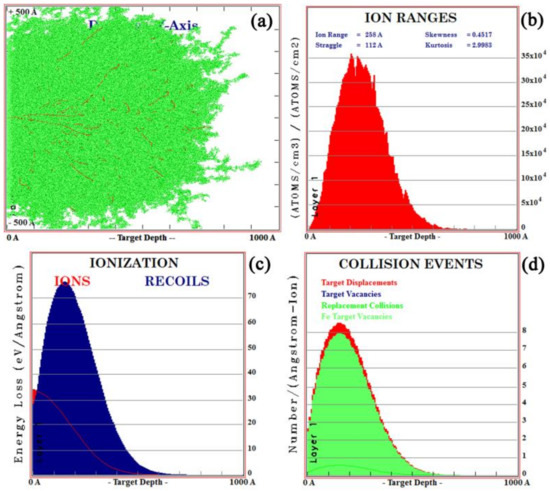 The SRIM is commonly used to simulate the ion sputtering process [26]. In this case, the ion range of all implanted ions in the simulation was calculated using dynamic simulation (TRIM) [27]. The impurity distributions of lanthanum and yttrium ions at ionic energies of 100 Kev and 105 Kev were simulated by TRIM. The results are shown in Figure 2 and Figure 3, respectively. As shown in Figure 2a and Figure 3a, each time an implanted ion collided with a target atom, a vacancy (lines of red dots) would be created, which would cause cascade damage (clusters of green dots) of the target atoms in steel. As shown in Figure 2b and Figure 3b, the maximum ionic ranges of lanthanum and yttrium were 50 and 60 nm, respectively, and both had a normal distribution, which was consistent with the XPS results. Figure 2c and Figure 3c show the ionization distribution in which lanthanum and yttrium ions lose their energy in steel samples, and it was observed that the host lattice arrangement of steel was damaged during the implantation of lanthanum and yttrium ions (Figure 2d and Figure 3d).