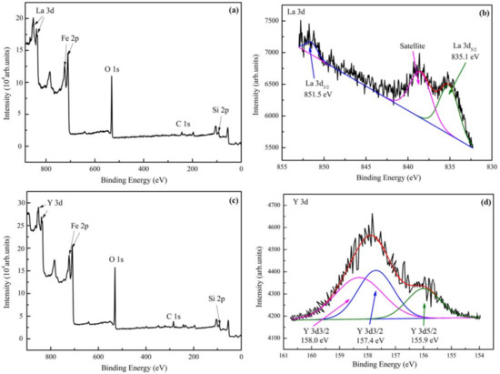 Figure 4 shows the XPS spectra of the samples after La and Y ion implantation, where contaminants on the surface were removed by Ar+ etching for 1 minute. Figure 4a,c show the full XPS spectra, which indicate that there are iron, oxygen, carbon, and silicon on the implanted lanthanum and yttrium surfaces, respectively. Compared with the binding energy of the standard absorbed carbon of 284.8 eV, the surface energy of the absorbed carbon in this study was 285.2 eV, which was 0.4 eV higher than that of 284.8 eV. The adjusted XPS data of La and Y are separately illustrated by Figure 4b,d respectively. Figure 4b shows the La 3d surface XPS spectrum. The three peaks correspond to La 3d3/2 (851.5 eV) and La 3d5/2 (835.1 eV). The spin-orbit splitting value was 16.4 eV, which clearly suggest a typical La2O3 pattern [28]. The phenomenon was also observed by Jin et al. [29]. Figure 4d shows the Y 3d XPS spectrum, and the peaks at 158.0 eV and 155.9 eV correspond to the Y–Y bond, and the peak at 157.4 eV corresponds to Y2O3. Consequently, this result illustrate that lanthanum mainly exists as oxides, while yttrium exists as oxides and metallic Y in the RE implanted layer.
