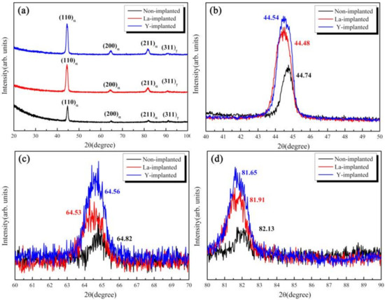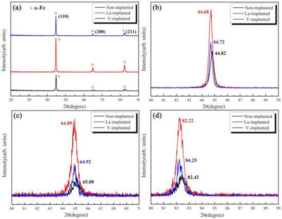 XRD patterns of the implanted surface with and without rare earth (RE) implantation—(a) XRD spectra; (b) diffraction angle of the (110) peak; (c) diffraction angle of the (200) peak; and (d) diffraction angle of the (211) peak.