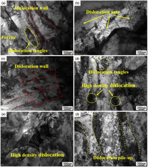 Figure 7 shows the TEM image of the surface layer of the samples, with and without ion implantation. It can be observed from Figure 7a,b that that there are some crystal defects in the 20Cr2Ni4A matrix, such as dislocation entanglement and dislocation grid, which form a stable defect network. The RE ion implantation caused lattice damage to the body-centered cubic (BCC) Fe matrix. From the observation of Figure 7c–f, the matrix implanted with rare earth ions forms high density dislocation entanglement compared to that of the non-implanted sample. Especially after yttrium ion implantation, the matrix was almost full of high-density dislocations, which accumulated and tangled [30].