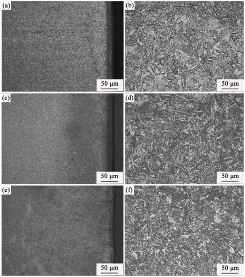 Microstructure of the carburized layer on the three samples—(a) carburized surface layer without RE; (b) core after carburizing without RE; (c) carburized surface layer after La implantation; (d) core after La implantation; (e) carburized surface layer after Y implantation; and (f) core after Y implantation.
