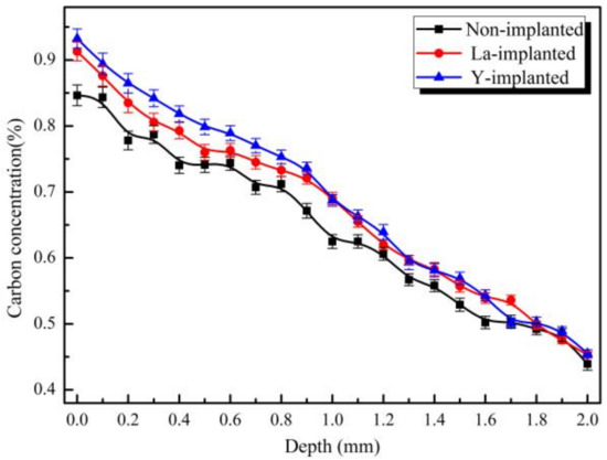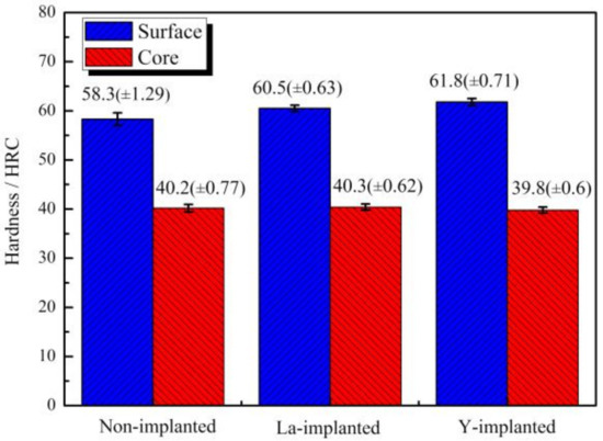 Figure 11 shows the results of the Rockwell hardness measurements. The surface Rockwell hardness of the non-implanted sample was 58.3 HRC, and the hardness of RE-implanted samples was higher than the previous value, especially samples with the yttrium addition. After vacuum carburization, the Rockwell hardness of the yttrium-implanted sample increased to 61.8 HRC at the subsurface layer; this value was higher than that of the lanthanum-implanted sample (60.5 HRC). In contrast, the core hardness value did not change significantly. The smaller error bar value indicated that there was no significant difference in the range of surface hardness.