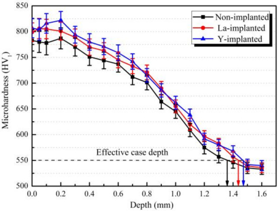 Figure 12 shows the microhardness results of the samples after carburization, with and without the RE ions. The fluctuation of the error bars were not more than 25 HV1. It could be seen that the microhardness of the carburized layer after RE ion implantation was higher than that treated by conventional vacuum carburization at 920 °C, and the change in the hardness gradient was minor. The maximum hardness of the carburized layer after ion implantation of lanthanum and yttrium occurred at 0.1 mm and 0.2 mm from the surface and was 805 HV1 and 822 HV1, respectively, which was higher than the value of 778 HV1 at 0.2 mm from the surface, after conventional carburizing. Osman Asi suggested that the enhancement in hardness was mainly caused by the diffusion of carbon atoms [33]. According to the GBT 9450-2005 standard, the effective hardening depths of the non-implanted, La-implanted, and Y-implanted samples were 1.36 mm, 1.44 mm, and 1.47 mm, respectively, as shown by the arrows in Figure 12. RE ion implantation increased the hardness of the carburized layer of the 20Cr2Ni4A steel but did not cause a significant increase in the depth of the effective hardened layer. Hence, the results showed that the microhardness of the carburized layer obtained by vacuum carburizing with yttrium was the highest, and the change was the most uniform among the samples considered herein.