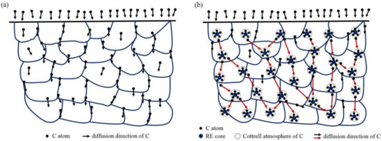 When solid solution RE atoms expand the lattice defects in the matrix, the distorted lattice region of the surrounding iron atoms becomes a trap for carbon atoms during carburization. Carbon atoms segregate into the voids of the distortion region [36], resulting in the formation of a nanoscale Cottrell atmosphere with the RE as the core carbon atom [2], as shown in Figure 16. Moreover, as shown in Figure 16a, carbon uniformly diffuses in the volume from the outside to the inside, in accordance with the concentration gradient in the austenite during conventional carburizing. The grain boundary diffusion was faster than that in the grains, and the finer the grain was, the faster was the diffusion rate. However, once the Cottrell atmosphere was formed during carburizing with RE ions, the diffusion mode changed from uniform diffusion to non-uniform diffusion [37]. As shown in Figure 16b, the Cottrell atmosphere also acted as an accelerator for diffusion [38]. First, the concentration of carbon atoms in the air mass was much higher than that in the matrix, resulting in a high concentration difference. Then, the larger the density of the air mass and the higher the average carbon concentration, the larger was the diffusion flux, such that the diffusion velocity and diffusion flux were significantly increased. Finally, the mechanism of carbon diffusion during RE carburization could be considered to be a result of jumping the short-circuit diffusion when the carbon atoms at the top of the last gas mass jumped to the next one. It could be concluded that the lattice damage and associated Cottrell atmosphere produced by the RE ion implantation changed the diffusion mode of the carbon atoms during the conventional carburizing processes and increased the diffusion coefficient of the carbon atoms.