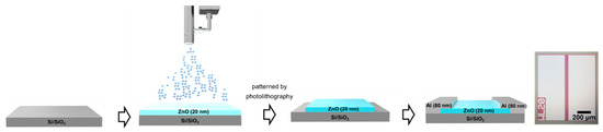 Fabrication procedure of ZnO field-effect transistors (FETs) by spray pyrolysis deposition and an optical image of the channel region. The ZnO (purple) channel layer and Al S/D electrode (light grey) were sequentially deposited on the Si/SiO2 substrate (dark grey) via spray pyrolysis and thermal evaporation, respectively. The channel region was patterned by photolithography to minimize the leakage current.