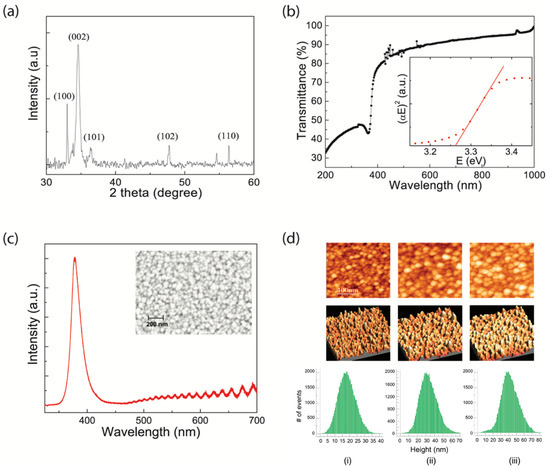 where , , and Eg indicate absorption coefficient, photon energy (E), and optical bandgap, respectively. From a fit of the plot of (αE)2 vs. the photon energy (E) (the inset in Figure 2b), we obtained the value of 3.26 eV. This value is consistent with that of polycrystalline ZnO, ~3.3 eV, and of other spray-processed ZnO films [28,29].