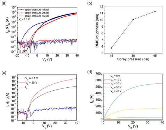 The spray-coated ZnO FETs were achieved through the process of optimization by tuning fabrication conditions, including spray pressure, the distance from the nozzle to the substrate, and process temperature. Among those, we especially focused on the spray pressure as it presented a critical influence on the FET properties and was directly related to the deposition rate, whilst not relatively well established when compared with other elements such as temperature [15,28]. Figure 3a presents the transfer characteristics of the ZnO FETs fabricated using various spray pressures of 15 psi, 30 psi, and 45 psi at a spray distance of 25 cm.