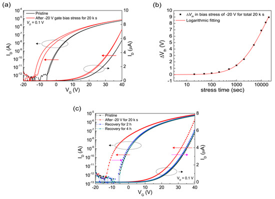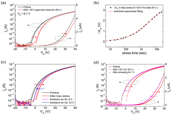 Figure 4a presents the shifts of transfer curves as a function of time before and after positive bias stress (+20 V) for 20 ks. The shifted transfer curve in parallel indicates that the threshold voltage shift () occurred with minimal change in SS. In both transfer characteristics before and after electrical bias stress, a hysteresis loop with minimal shift was observed. The threshold shift induced by positive gate bias stress followed stretched exponential behaviors, which is described by Equations (5) and (6) [43].