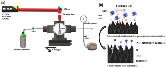 (a) Schematic of the experimental ultrashort laser setup used in this study. Experimental procedure of the fabrication of the functionalized micro/nanopatterned steel substrates using ammonia gaseous atmosphere during the irradiation procedure; (b) Schematic of micropatterned substrates during and after ultrashort pulsed laser processing under gaseous ammonia atmosphere.