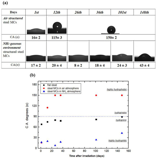 (a) Evolution of the profile of a water droplet placed onto laser-fabricated steel surfaces in air (top) and NH3 (bottom) atmosphere, respectively, as a function of the time after irradiation; (b) Contact Angle (CA) evolution for 148 measurement days of flat (black spots), air-structured (red spots) and ammonia-structured (blue spots) steel surfaces.