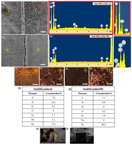 (a) Top-view SEM image of steel micro-cones (MCs) fabricated in air following the corrosion test (scale bar: 100 μm); (b) EDS spectra from regions 1 and 2 shown in (a). The corresponding elemental analysis is shown in (i); (c) Top-view SEM image of steel MCs irradiated in NH3 (scale bar: 100 μm); (d) EDS spectra from region 3 shown in (c); The corresponding elemental analysis is shown in (j); (e–h) Microscope images of regions 1–4 shown in the SEM images (a,c) (scale bar: 100 μm); Photograph of laser-treated steel sample in air (k) and ammonia (l); The black square corresponds to the structured area.