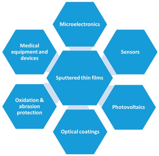 Another important area of ongoing research is the development of sputtered metallic and the high-entropy alloy-type (either pure metal-based or metal-composite alloy, or metallo-ceramic) thin-film materials for various emerging applications, such as radiation shielding and magnetostatic shielding, reported in [,,]. Figure 1 presents a wide range of possible application areas of sputtered thin films for continued exploration by future generations.