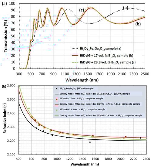 Figure 2a shows the measured transmission spectra of as-deposited Bi2Dy1Fe4Ga1O12 (BiDyIG) garnet and BiDyIG:Bi2O3 (17 and 23.3 vol. %) composite thin-film layers prepared on glass substrates by using an RF magnetron cosputtering process. These particular garnet types possessed MO garnet compositions (and optical properties) of special importance in common application areas, e.g., Faraday rotators, ferromagnetic resonance-based microwave devices, MPCs, and MO imagers. In the cosputtering process, two separate oxide-mix-based ceramic targets (Bi2Dy1Fe4Ga1O12 and Bi2O3) were used and the materials volumetric fraction ratios were controlled and calculated from their partial deposition rates. The details of several GOC layer deposition technologies and sputtering process parameters are described in [,,,]. From the thickness-dependent transmission-wave interference fringe intensities (measured over a wide range of wavelengths in all samples, Figure 2a), using a new combinatorial approach, the optical constants of amorphous garnet precursor layers are calculated and refined, together with the film thickness confirmation []. This combinatorial approach employs a custom-built spectrum-fitting software in conjunction with the Swanepoel envelope method (SWEM). The following operational steps are conducted for the evaluation of optical constants: (i) Calculation of the refractive index data and film thickness using the SWEM method []; (ii) use of the calculated index data (from SWEM), in conjunction with least-square fitting to derive the real part of the index from Cauchy’s formula (n (λ) = a + b/λ2); (iii) use of the refractive index data (derived from Cauchy’s formula) in magnetic photonic crystal (MPC) analysis software [] to model and fit the measured transmission spectra; and (iv) from this fitting process, reconfirm the film thicknesses and derive the absorption coefficient spectra of the films. The wavelength-dependent index (n) data (calculated based on Cauchy’s dispersion formula) for the amorphous garnet and garnet-oxide precursor thin layers deposited on glass (Corning Eagle XG, 0.5 mm thick) substrates yield the following spectral dependency for BiDyIG sample, n = 2.1906 + 0.0459/λ2, and for BiDyIG:Bi2O3 (17 vol. %) composite sample, n = 2.2105 + 0.0576/λ2. For BiDyIG:Bi2O3 (23.3 vol. %) composite sample, the index dispersion function n = 2.1961 + 0.0683/λ2 was obtained.