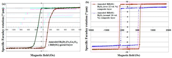 Hysteresis loops of specific Faraday rotation at 532 nm measured in sputtered garnet films. (a) Annealed (nanocrystalline) Bi2Dy1Fe4Ga1O12 (BiDyIG) sample, and (b) annealed BiDyIG: Bi2O3 composite-type oxide-diluted thin films [].