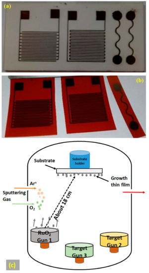 RuO2 thin-film electrodes (potentiometric, interdigitated, and resistive) were deposited directly onto two different substrate materials (alumina and polyimide), as shown in Figure 5. In summary, 100 nm thick layers of RuO2 were deposited using RF magnetron sputtering from a metal oxide (RuO2) target (99.95% purity) with 110 W sputter power, at room temperature, and with 4 mTorr chamber pressure. From our previous experience with RuO2 thin film growth on different substrates, e.g., Al2O3 and glass, we found that the films possessed better crystallinity if they were prepared with total process-gas pressure at above 4 mTorr, with ≥50% of oxygen partial pressure in the plasma []. We adjusted the partial pressure ratio for Ar and O2 to be as close as possible to 1:1, by way of adjusting the partial gas flow rates, which were measured by the flow rate meter. Several batches of high-quality RuO2 films were deposited by using an RF magnetron sputtering system (KVS-2004L, Korea Vacuum Technology Ltd., Gyeonggi-do, Korea). At least a dozen process parameter optimization runs were performed, while depositing test film batches, adjusting the various experimental parameters (e.g., the partial gas pressures and RF power densities), and making process calibration experiments, before the final high-quality batches of RuO2 films were fabricated. The oxide-based target material (RuO2) of 4-inch (10.16 cm) diameter was placed at one of the guns of the up-sputtering system, having about 18 cm of source-to-substrate separation, as shown in the schematic diagram (Figure 5c). In this sputtering system, all the guns with independently activated shutters are placed at the corners of the equilateral triangle and tilted towards the substrates. The substrates’ stage rotation was adjusted (as a result of prior process optimization efforts) to be near 10–11 rpm during the deposition processes, and the film thicknesses were monitored during the deposition using a calibrated microbalance quartz sensor. Electrode patterns were achieved using a standard photolithographic process.