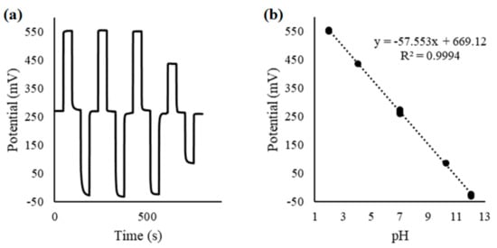 Electric potential recorded vs. a Ag|AgCl|KCl reference electrode for the potentiometric RuO2 electrode on polyimide substrate, in pH 2, 4, 7, 10, and 12 buffers (a); and the reversible linear Nernstian pH response of the electrode (b).