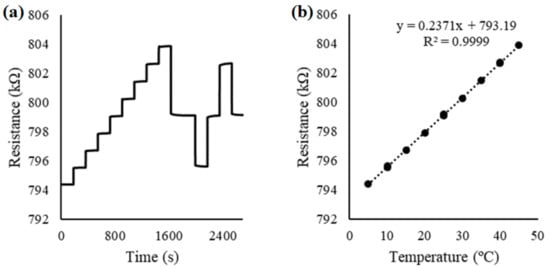 RuO2 films sputter-deposited directly onto flexible polyimide substrates can be a cost-effective choice for use as a potentiometric electrode. It was found experimentally that the polyimide-based electrodes prepared using a 4 mTorr chamber pressure and 1:1 Ar:O2 gas ratio showed excellent performance when used as potentiometric pH electrodes (vs. Ag|AgCl|KCl reference electrode), exhibiting a reversible (±3.9 mV), linear (R2 = 0.9994), and Nernstian (57.5 mV/pH) pH response, as shown in Figure 6. The obtained result is comparable to previously reported RuO2 pH electrodes prepared on alumina substrates, which also exhibited a reversible (±1.8 mV), linear (R2 = 0.9999), and Nernstian (59.1 mV/pH) pH response []. The polyimide-resistive and interdigitated electrodes failed when used as conductivity and temperature sensors, due to gradual delamination. However, the alumina-based resistive temperature sensor exhibited a reversible (±0.01 °C), linear (R2 = 0.9999) response, which is comparable to some commercially available sensors as shown in Figure 7.