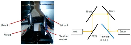 Several batches of MDC (Ag/MgF2) films were deposited onto glass substrates by using the cosputtering process in an RF magnetron sputtering system. The volumetric fraction of dielectric (MgF2) phase was controlled by adjusting the RF power densities applied to the MgF2 sputtering target during the cosputtering process, after carefully calibrating the partial deposition rates for both MgF2 and Ag. The thicknesses of ultrathin composite films trialled were in the range between 12 and 25 nm. After the successful growth of MDC layers, we prepared several multilayer structures, introducing the optimized MDC layers along with surrounding oxide layers. Table 2 summarizes the deposition process parameters used to fabricate these metal-dielectric nanocomposite layers and MDC-containing multilayer building blocks. The transmission and reflection spectra of MDC layers were measured just after the deposition using an Agilent Cary 5000 UV-VIS-NIR spectrophotometer (Agilent Technologies Australia Pty Ltd., Sydney, Australia). The reflection spectrum measurements were carried out using a custom-built reflection-mode optical measurement module mounted inside the spectrophotometer, which contained four mirrors adjusted at 45° tilts to form a periscope-type device as shown in Figure 8.