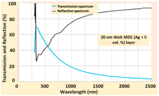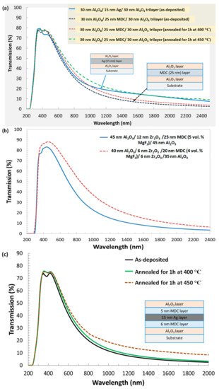 Several trilayer structures containing at least one MDC layer were deposited on clear glass substrates using one continuous sputtering run, and their optical performance was characterized. Figure 10a shows the transmission spectrum of as-deposited multilayer coatings, where the layer structure consists of at least one MDC (Ag + 4–5 vol. % MgF2) in comparison to that of a typical trilayer pure metal (Ag)-based DMD-type coating. It can be noted that the use of a 25 nm MDC layer instead of a pure 15 nm Ag layer resulted in better thermal radiation filtering performance without compromising the visible spectral transmission, whilst avoiding any potential layer morphology-related issues that usually affect ultrathin (thinner than about 17 nm) layers. Experimental investigations revealed that the cosputtered MDC (even comparatively thicker) layers with high metal volume content could be embedded into any type of multilayer structures for possibly improving the spectrally selective transparency control and structural properties of the coating, whilst allowing significant design flexibility. Particularly important is the possibility of depositing MDC-type layers onto practically any underlying film layers, almost regardless of surface energy-related layer interface compatibility considerations. The MDC-based structures also demonstrated much lower thermal emissivity, whilst maintaining the same superior visible transmission compared to the silver-based coatings, as shown in Figure 10a.