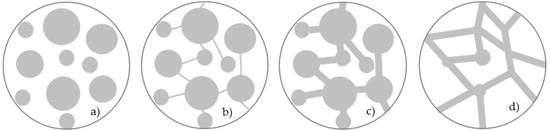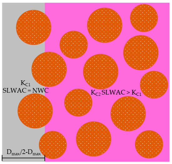 In SLWAC, the LWA particles are isolated and dispersed throughout the concrete and usually surrounded by cement paste with low pore connectivity. In cement pastes with a medium degree of hydration and a w/c lower than 0.5, a matrix with a closed pore structure can be expected [26]. As such, SLWAC should behave as a system represented in Figure 1a,b [25]. Therefore, although SLWAC is a highly porous material, this does not necessarily mean that exhibits high permeability.