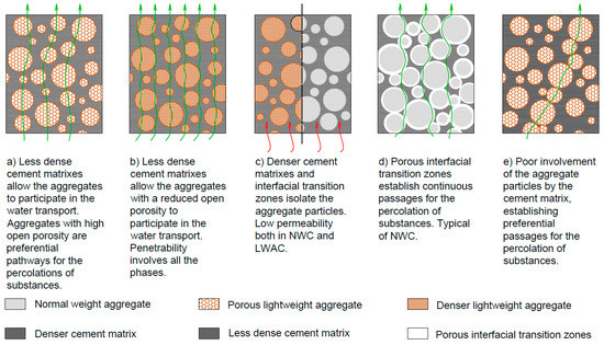 However, Al-Khaiat and Haque [64] found similar higher water permeability in SLWAC than in NWC of equal strength. Moreover, Nyame [65] reported that mortars with LWA presented water permeability twice as high as those of mortars with NWA with the same w/c. Both these studies highlight the fact that the participation of the aggregates in the water transport depends on the relative importance of the different phases in the mixture, as depicted in Figure 2.