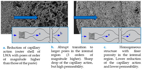 As mentioned, concrete transport properties are directly related to porosity. However, according to Bogas et al. [29], in SLWAC, capillary absorption and permeability are influenced by the porosity of the LWA in different ways. For instance, an abrupt transition from the porosity of the paste to that of the LWA (2–3 orders of magnitude higher) leads to an accentuated drop in capillary action, but increased permeability (Figure 3). In fact, the capillary effect is reduced in pores of high dimensions, as is the case of LWA [35]. According to Smeplass [75], in SLWAC with low w/b, the fine pore system of the cement paste limits the ability of the LWA to contribute to the capillary water transport. However, in SLWAC with high w/b, the pore system is coarser and the capillary resistance of the paste is reduced, allowing the LWA to better participate in water transport. Hammer and Hansen [79] further reported that, as the pore sizes of LWAs are often much higher than those of the paste, the capillary forces in the LWAs are not strong enough to increase the water flow in the paste.