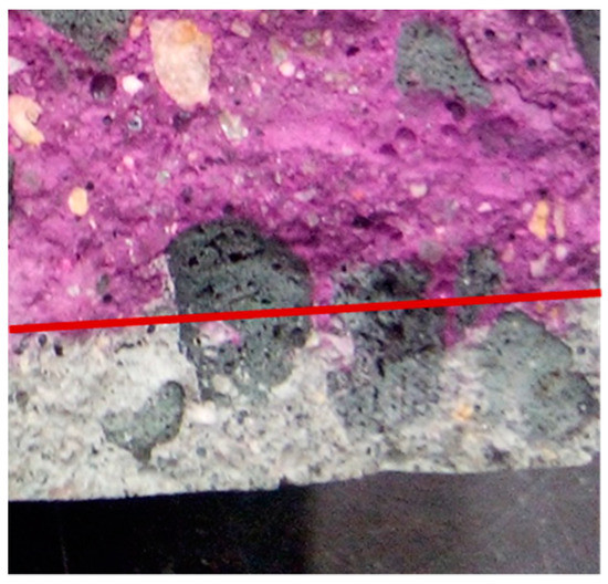 The carbon dioxide diffusion rate through concrete is mainly governed by the characteristics of its porous structure. Due to their higher porosity, LWAs present lower carbonation resistance than NWA [9,25,40], which favours the carbon dioxide (CO2) diffusion. Moreover, contrary to the cementitious matrix, LWAs do not have CO2 binding capacity [2,86]. In fact, Schulze and Günzler [57] confirmed a deeper carbonation front in the region of LWA than through the surrounding bulk cement matrix. This was also observed by Real [86], when SLWAC was produced with porous LWA (Figure 4). However, when less porous LWA with a dense outer shell was used, the carbonation front was not necessarily higher through the aggregate (Figure 5).