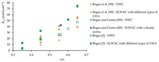 In fact, various authors report similar capillary absorptions in both SLWAC and NWC, inferring that, for low w/c, the participation of the LWA in this transport mechanism is not significant [6,29,35,83]. Real et al. [6] studied the capillary absorption of SLWAC with four types of LWA, different types and volumes of binder and w/b between 0.35 and 0.55. The authors confirmed that, except for LWA with high porosity and superficial cracking or without a dense outer shell, the absorption coefficient was not significantly influenced by the type of aggregate, depending essentially on the quality of the matrix and ITZ. The same was found by Bogas et al. [29], even taking into account very different drying degrees and w/c. The authors concluded that the high porosity of LWA appeared to be of secondary importance to this property. The low influence of LWA was also confirmed by the similar absorption coefficients found in SLWAC produced with distinct volumes of the same type of LWA or with partial replacement of NWA by LWA [29].